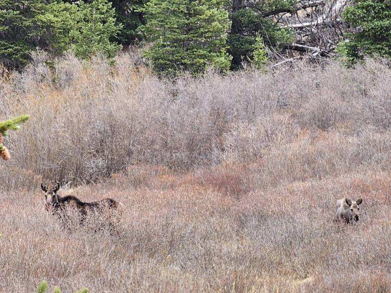 Imagine our surprise when we saw not just a moose but a mother and her yearling munching on aquatic grasses in a low wetland behind a partial screen of evergreens.