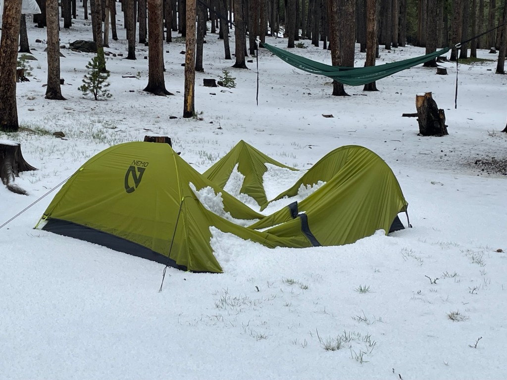 There was nothing we could do about it until the storm passed, so we played Gin Rummy. Eventually the storm stopped. We scraped, pushed, and pulled sheets of frozen hailstones off the tent and re-set the supporting poles. Despite the rain and hail, the tent’s interior was bone dry. Good job, little Nemo tent.