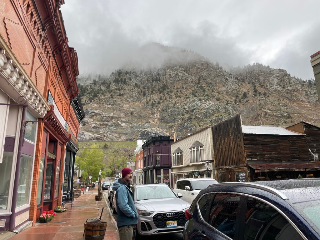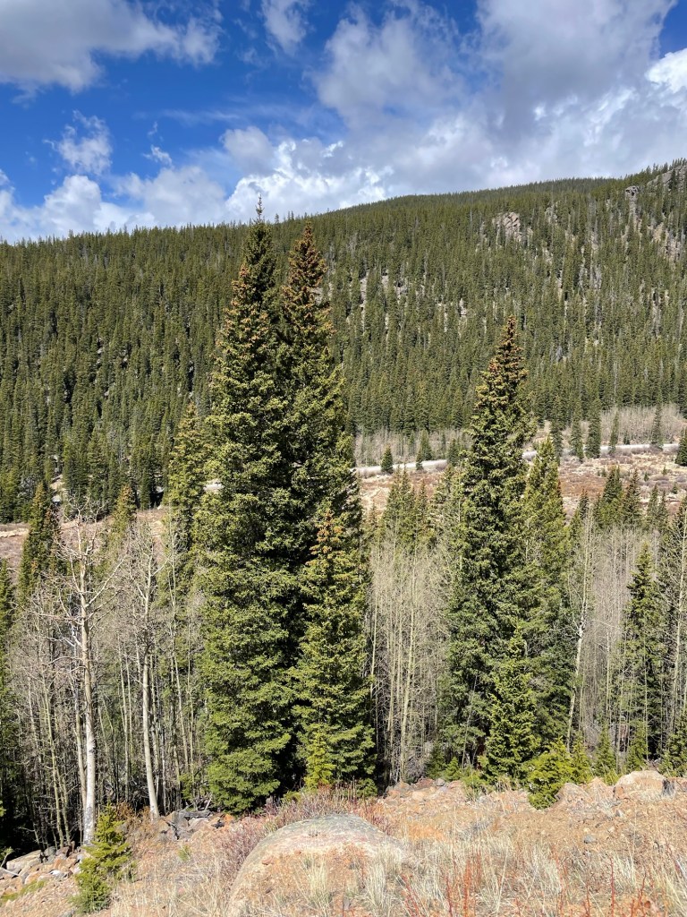 We decided to go for a drive and head further up the Guanella Pass, possibly even to Georgetown for lunch. I learned from an informational placard at a turnoff that the odd trees with pinecones only on top that I’d been seeing are called Engelmann Spruce and often live for 450 years. I’m still confused about the evolutionary benefit to having its pine cones only at top of the tree.