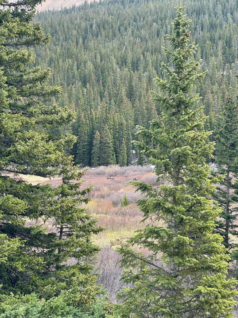 It was a 7 mile hike, one way, to Bierstadt and 4 miles to the other, and a bit late in the day to start either hike, so after a bit of gazing, we continued on toward Georgetown. Along the way, we saw a few cars stopped along the roadside. “Bear?” we all asked.
