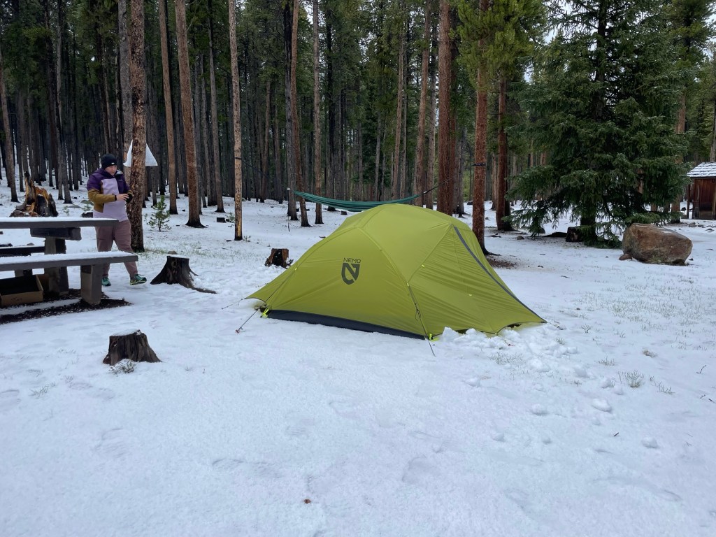 Back in the trailer, we went through round two of rain, thunder snow, and hail. Jess chose to sleep in the backseat of the truck versus risking another hail avalanche. It rained, thundered, and hailed some more until about midnight, ultimately freezing the ground solid.