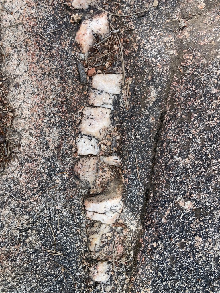 A couple of months back, we watched an older TV series called How the Earth was Made, sipping it episode by episode. One of the common themes throughout (earthquakes! tectonic plates! volcanoes!) is how magma pushes through cracks to form intrusive bands of igneous rock like the one you see below. We enjoy seeing examples of it on our hikes. It reminds me of backbones.