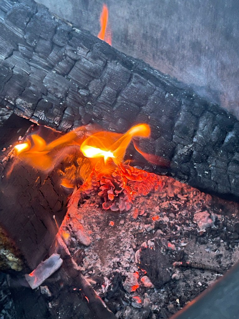 One of the things we’re learning is that I’m our fire whisperer. When Jeff has declared a fire played out, I can usually get it going again. As for getting it started, step aside, I’ve got work to do. I don’t know why, but where the logs should go and where and when it needs more oxygen just makes sense to me. My reflexes are crap, so I can’t catch anything you toss to me, but I can burn a pile of logs to ash.