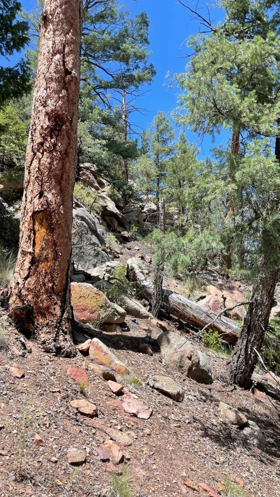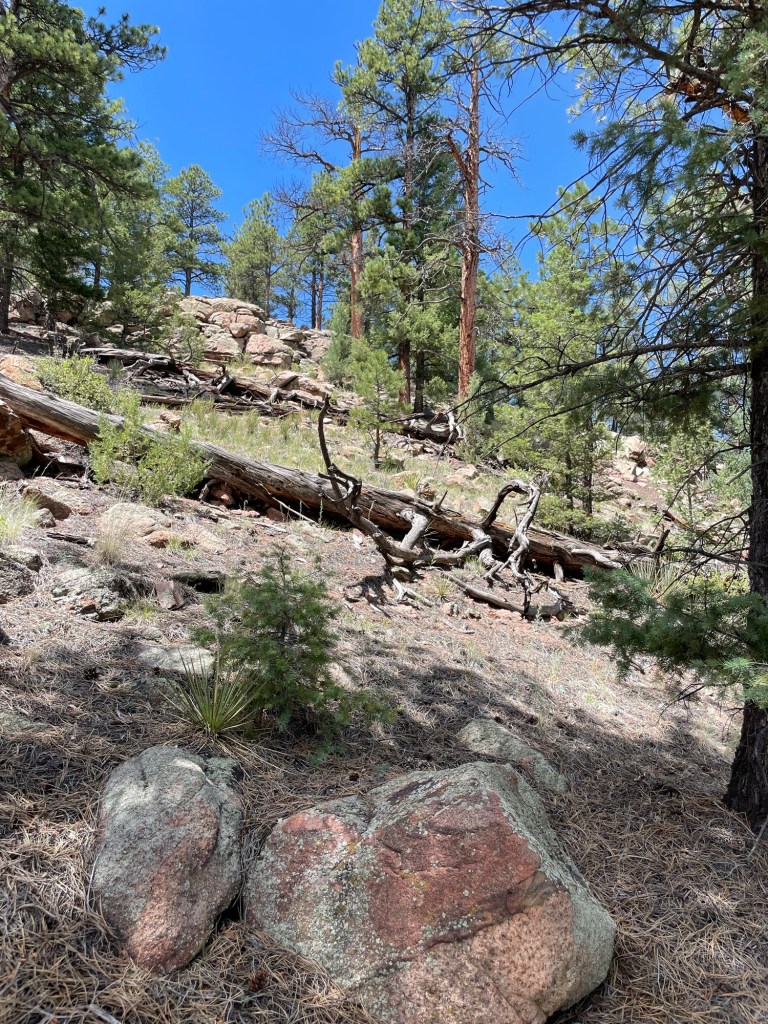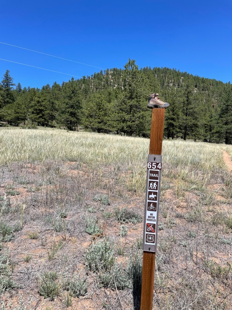 After arriving mid-day last Friday, we found a nice little trail to stretch our legs and check out the area. What we found is that the trail went Up Up Up and then Down Down Down into another campground that sits on the South Fork of the South Platte River. At some point we wandered off the official trail and had to figure out a way back to it. We also hiked it in our running shoes; we should have had our boots on. One of those, ‘It’s only a mile,’ moments.