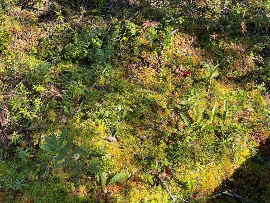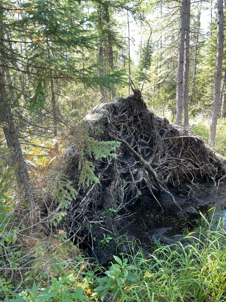 In the bog, tree roots are especially vulnerable to uprooting and we saw many uprooted and on their side like the one below. It’s so easy to forget how wide but shallow tree roots are until you see something like this.