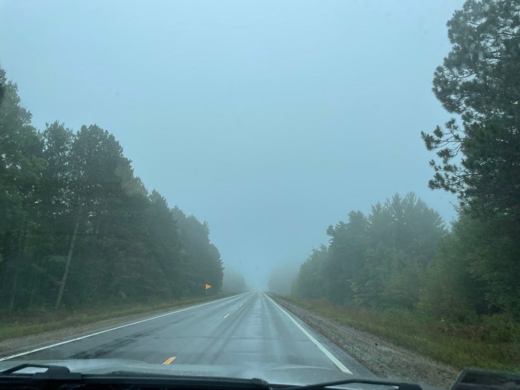 Over lunch, we discussed options. With some storms coming in, we debated whether we should go east to outrun them, hunker down here for the weekend, or go north to International Falls as we’d planned.