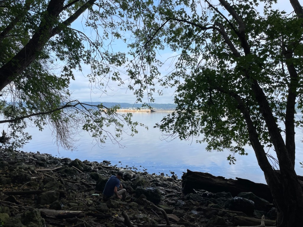 The first morning there, we took a steep, slick, rocky trail down to the waterline and caught sight of a few barges floating past. The thrum of their diesel engines over the water is very distinctive, similar to the rhythmic chugging of train wheels across tracks, but deeper and a little slower.