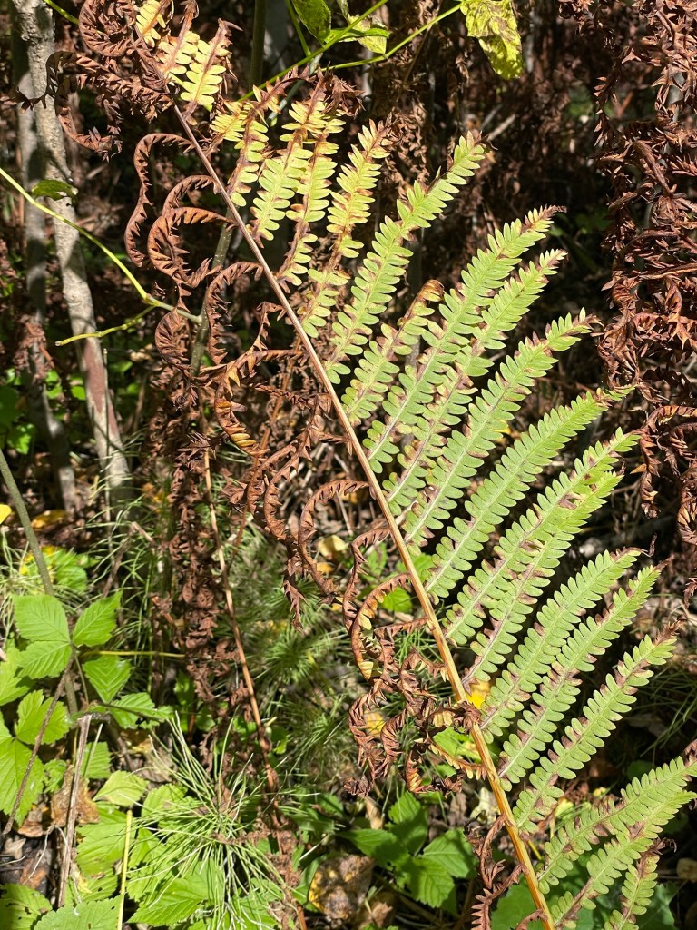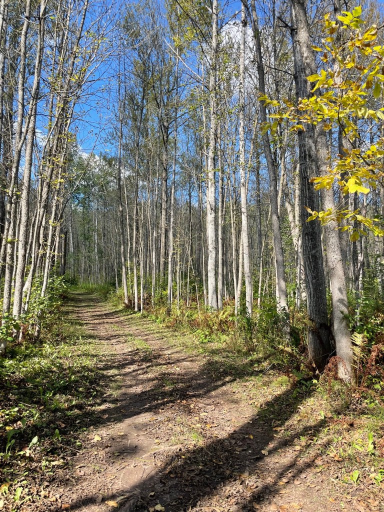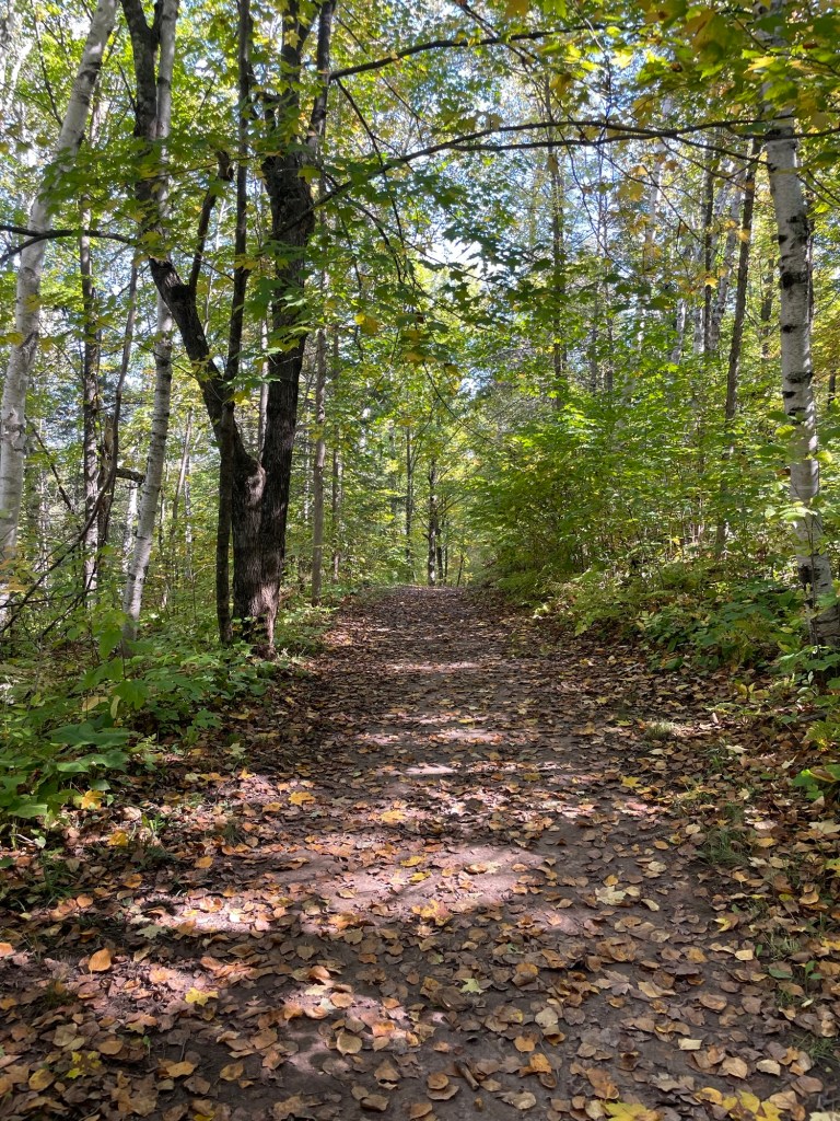 Although best known for its Swinging Bridge, we thought Jay Cooke’s forest walks were the real treasure. It didn’t hurt that it’s autumn, the colors were really starting to pop through, and the weather was soooo fine. Sunny, 70° days, and with nary a raindrop or a mosquito to be seen. A welcome change. You can almost hear the leaves crunching underfoot just by looking at this trail.