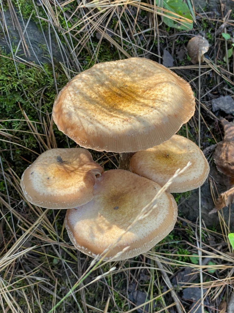 I continue to feed my morbid fascination with mushrooms that look like they’re plotting our demise. The one below is possibly a variety of Armillaria mellea, better known as Honey Mushroom. If so, the internet says they’re edible. Thank you, hard no.