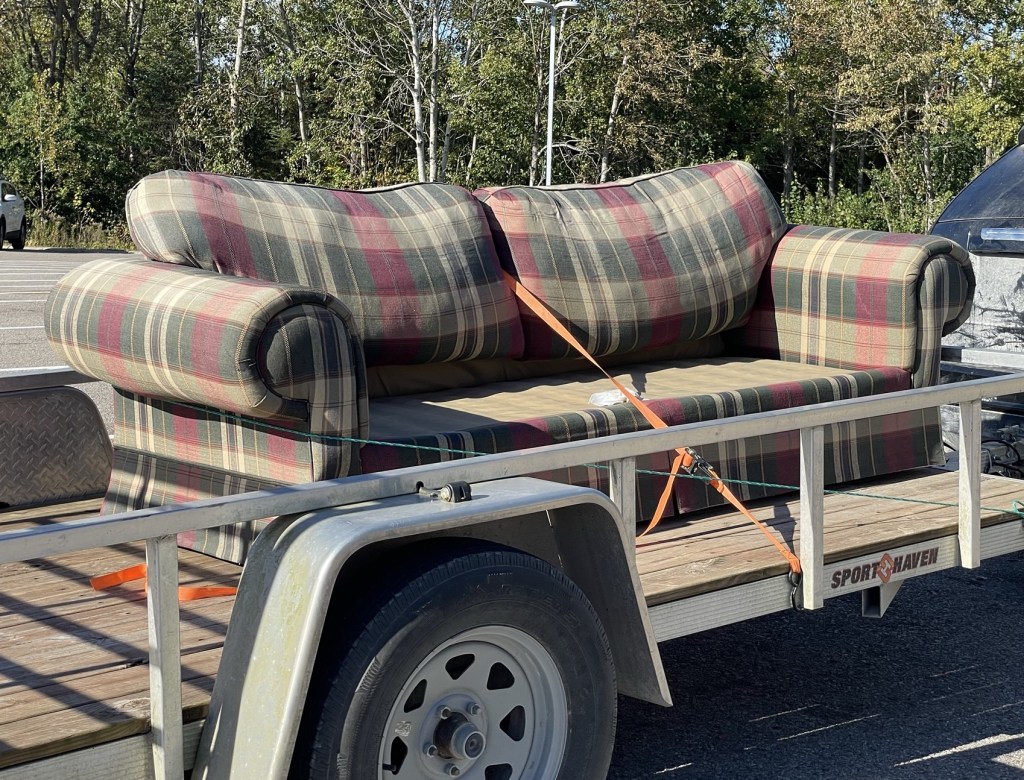 Back on the road, we realized the time and decided to stop for a quick snack. Pulling into a fast food place, we were shocked to see a couch on a flat bed trailer. To be more specific, we saw what looked like Ian’s couch, right down to its missing its feet and looking a bit faded and worse for wear. Several staff members went out to see it while we were there, as its owner was trying to find a new home for it. We got a hearty laugh out of the whole situation.