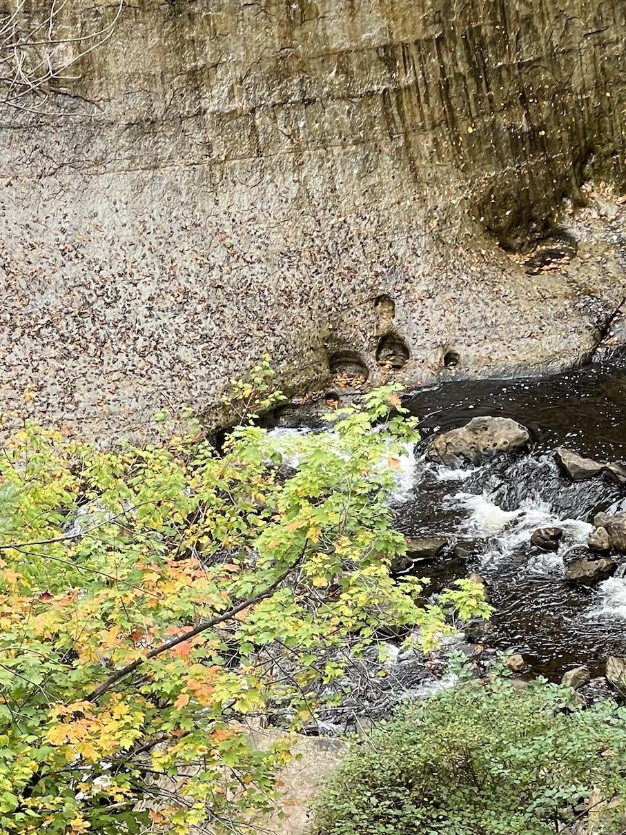 Did you notice the little circles at the base of the falls? They were created by water, rock, and a geological spin cycle. Called kolk basins, they’re formed when very fast water gets into a depression and spins a small object inside of it, eroding the slight depression into a deep, circular pit.