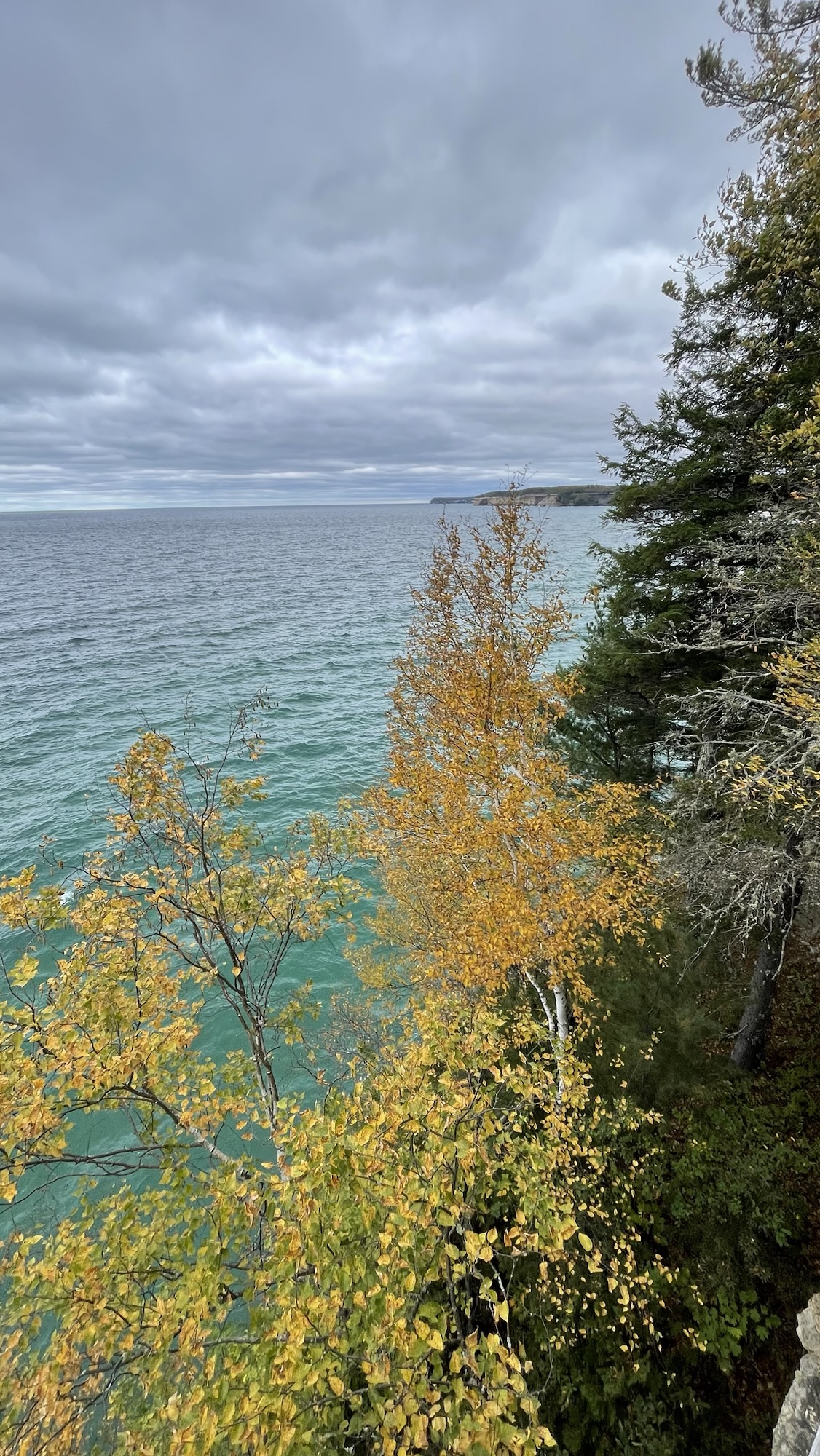 If the sun had been shining and we’d been on a boat, the brown, orange, yellow, red, green, and black bands of color would have really stood out. But trust me, no one wants a seasick Jeff on their boat. (I recommend you go to the Pictured Rocks NL website to see what the pros have captured.) From up above on the observation decks, you get a good look at the stunning water variations though. Every shade of blue and green seemed present out there.