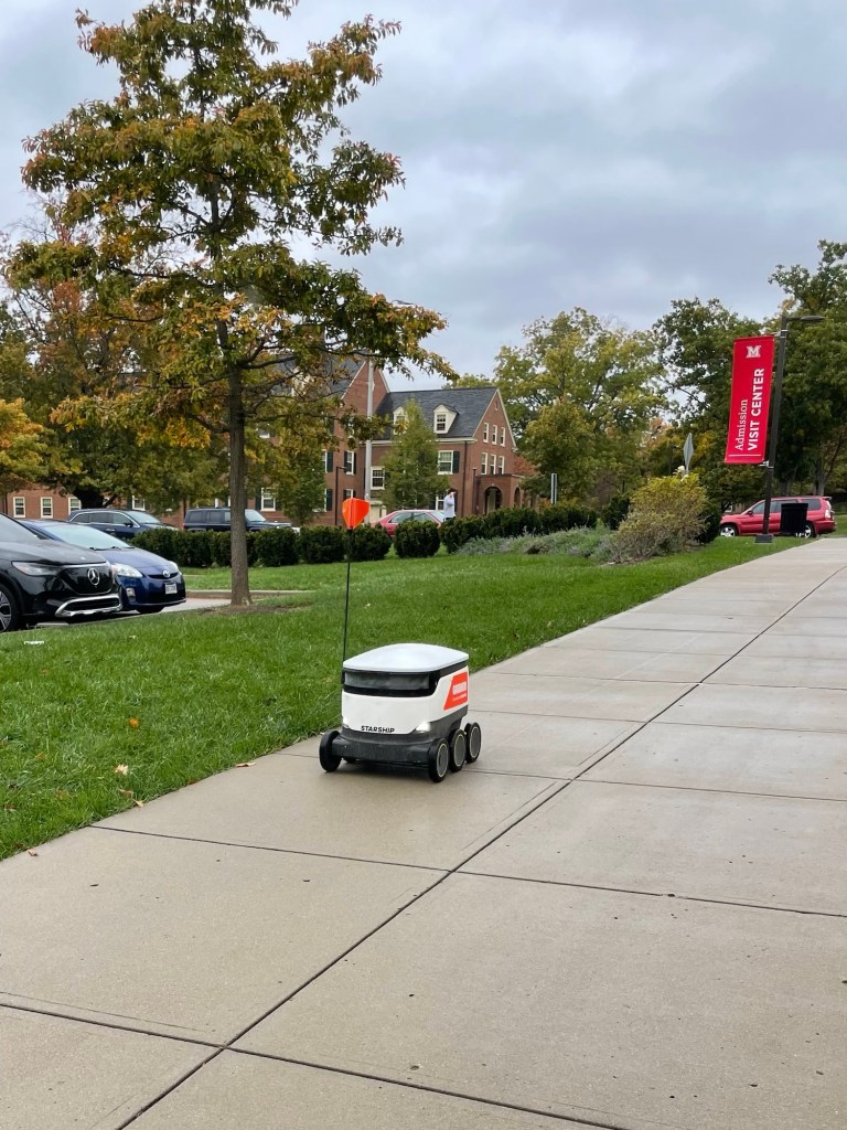 Heading into the campus proper, we saw a few of these little GrubHub delivery bots cruising around. They even navigated busy roads at pedestrian crossings. The intermittent rain didn’t seem to affect them at all.