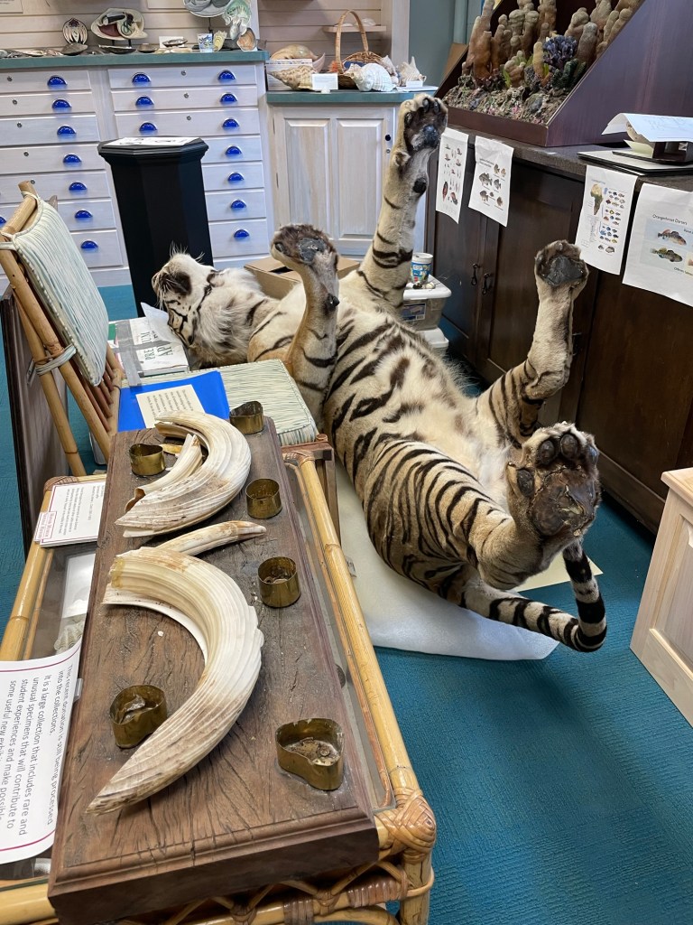 After visiting the Hefner Museum of Natural History, an absolute wonder of assorted taxidermy, we wandered the rest of the basement’s hallway and checked out a few of the other specimen rooms in Upham Hall. At the back of the mollusk/shells room, we came across a poor upside down tiger. That was a belly just begging to be rubbed! I ask, how often do you get the chance to see murder paws up close? Yes, we refrained from touching it, knowing that the oils on our hands would be detrimental to the skin and fur in the long run, but it wasn’t easy.