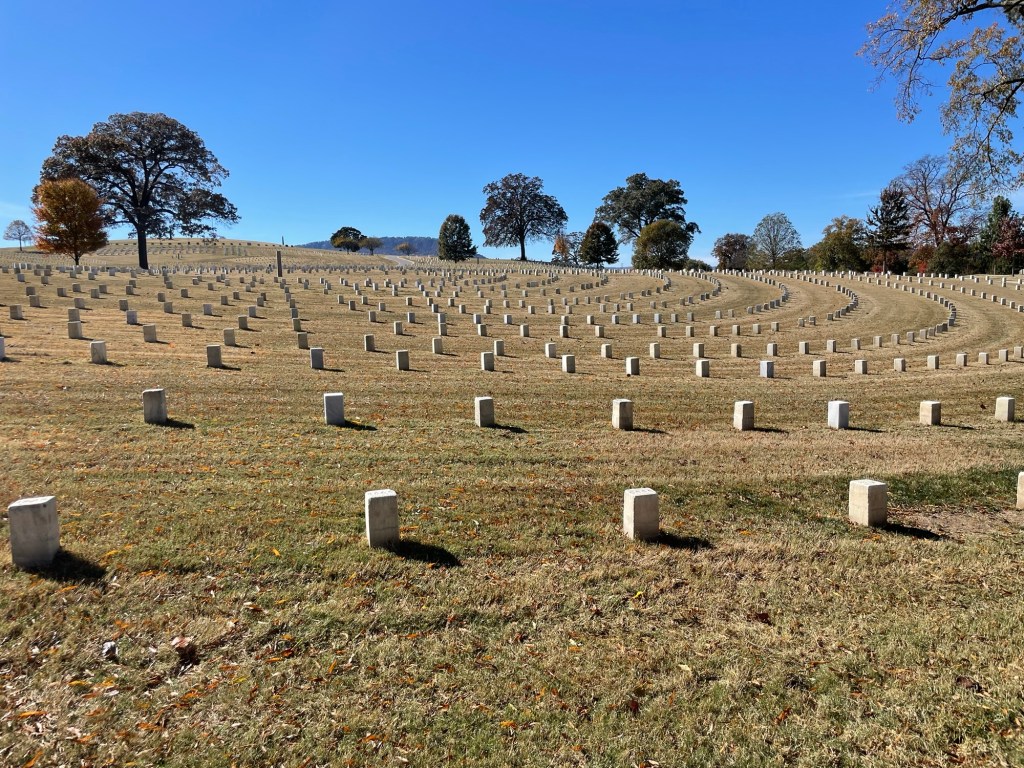 At the Chattanooga National Cemetery, each of the 6×6 markers above is for an unknown Union soldier, most from the battles of Chickamauga & Chattanooga. There are many more such markers throughout this cemetery, as well as regular military tombstones from the Civil War through today. The Confederate dead from the battle were interred in Georgia at the Marietta Confederate Cemetery.