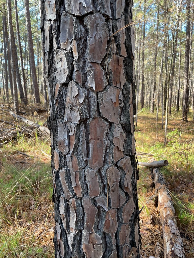 The almost squared off bark tiles of the Pinus echinata (Shortleaf Pine) at Mistletoe State Park captured my fancy. I saw one today too, right at the campsite. Talk about situational blindness. The trees themselves are very tall, but the branches don’t start until quite far up the trunk. It creates a canopy not unlike a series of umbrellas, allowing you to see deep into the forest, despite so many tree trunks all around. They do indeed let you see the forest for the trees.