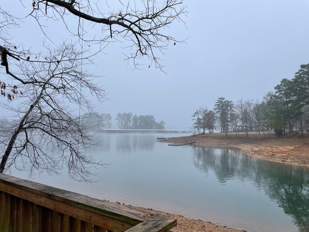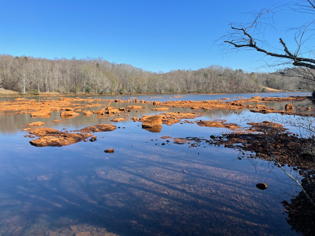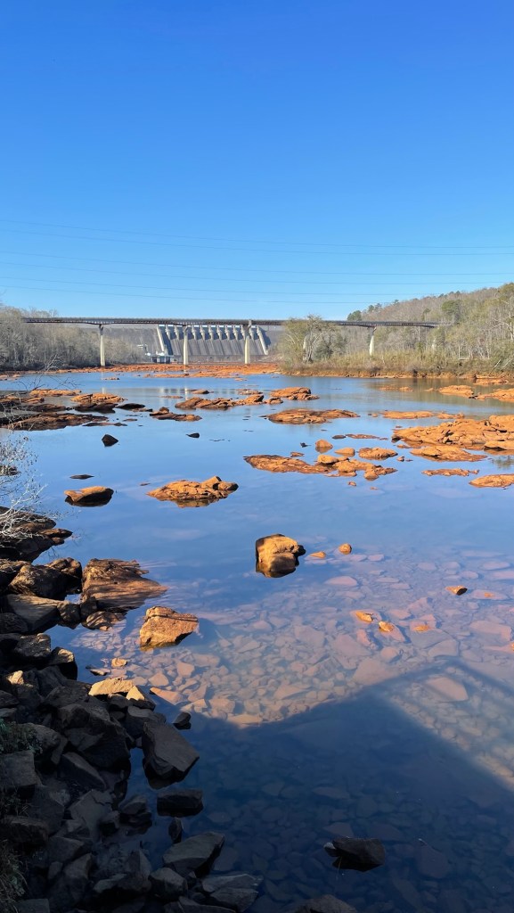 We’ve passed by the dam, below, on many of our drives between Georgia and South Carolina. It’s holding back that big wild oak leaf that is Lake Hartwell. The dam itself is rather uninteresting, seen one and you’ve seen them all, but the downstream area has striking red rocks peaking out of the crystal waters of the Savannah River.