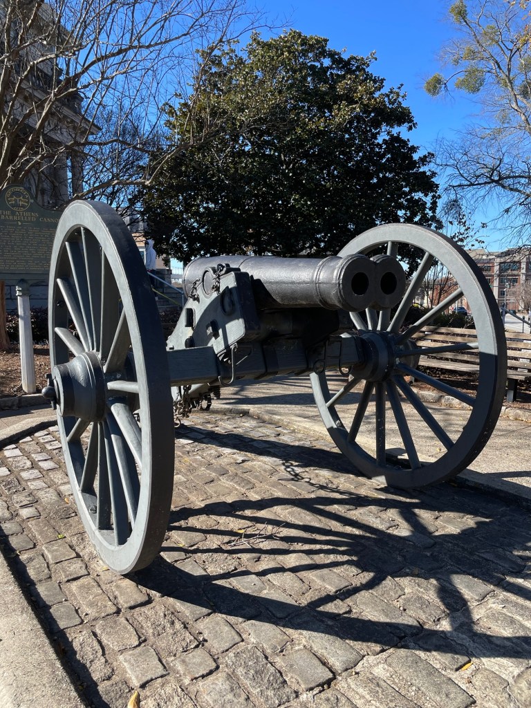 A fun fact about this double barreled cannon is that it’s the only one known to still be in existence. It was a prototype designed to shoot two cannonballs connected, by a chain, into a regiment of oncoming soldiers, “to mow them down like a scythe through wheat.” That did not happen. Unable to find a way to light both charges simultaneously, its only contribution to the Civil War was to become an addition in the Nope Files and a quick lesson in how wildly cannonballs can fly. As safe as loosing two cats tied together at the tail into a wading pool full of toddlers.